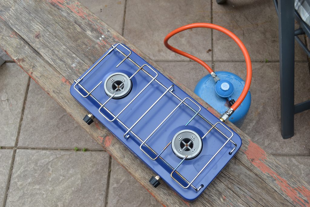 Die erste Option ist mein bisher auch verwendeter Gaskocher „Base Camp“ der Marke Campinggaz. Der Gaskocher ist ein kleiner kompakter Einstiegskocher mit zwei Flammen. Der Kocher wiegt nur 1,4 Kg und hat Maße von 43 x 24 x 8 cm. Damit nimmt er auch in einem kleinen Camper wenig Platz weg.