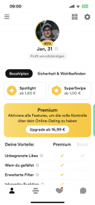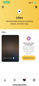 Die App hat vier Hauptbereiche. Unten Links kommt man zu seinem eigenen Profil. Dort kann man sein Profil weiter anpassen und wenn man möchte einen Premium Account buchen. Des Weiteren hat man oben rechts die Möglichkeit noch ein paar Einstellungen der App zu verändern. Dort kann man u.a. den Modus ändern, eine Inkognito-Funktion aktivieren, ein Automatisches Spotlight aktivieren und den Standort. Der aktuelle Standort wird auch den anderen Mitgliedern beim „Swipen“ angezeigt.