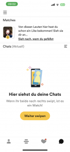Man hat allerdings auch die Möglichkeit, dass man diese Zeit um 24 Stunden verlängern kann. Also ging das Spiel von vorne los und es wurde wieder fleißig gewipt. Da nur schleppend neue Likes für mein Profil angegeben wurden, habe ich relativ schnell auch wieder das Interesse an der App verloren. Ich behaupte von mir, dass mein Profil keine Vollkatastrophe ist und ich auch keine komplett unattraktive Person bin. Und deshalb hat mich die erste Bilanz nach zwei Wochen etwas frustriert: 1 Match und kein einziger Chat.
